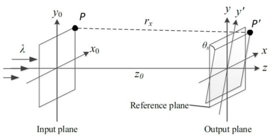 where θ𝑥 stands for the angle of x axial rotation. When the output plane revolves the x axis and is not parallel to the input plane, only the Fresnel diffraction of the object on the tilted plane [,] would be calculated in order to parallel the diffracted output plane with the reference plane. To acquire the tilted Fresnel equations, the signal on the input plane is transformed, shown as Equation (2) below: