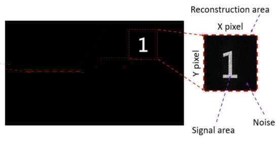 In this study, qualities of diffraction imaging results and simulated imaging results were assessed, and the criteria included relative diffraction efficiency (RDE), root mean square error (RMSE), and signal to noise ratio (SNR) [,,]. Before the aforementioned assessments, signal reconstruction and area reconstruction needed to be defined, as in Figure 7. Signal reconstruction was the signal area of the reconstructed target image, while area reconstruction was the entire area for reconstruction. The reconstruction image area was assumed as X × Y, including signal area and noise of the reconstructed target image, and the intensity of reconstruction signal and noise was assumed to be and , respectively.