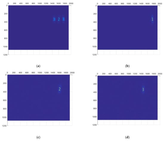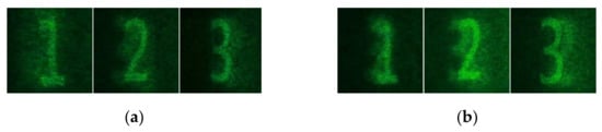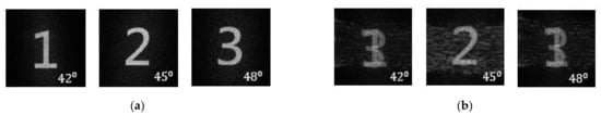 In the second part, the multi-angle image, the digits “1”, “2”, and “3” were placed at the reconstruction distance 0.2 m, with the encryption angles of , , and , respectively, for the phase-locked encryption transform. By switching the corresponding phase-locked keys in the reconstruction, the images with corresponding angles could be effectively reconstructed. Figure 9 shows the reconstruction simulation results. Noticeable differences can be seen in Figure 9a,b; with the phase-locked algorithm, the interference of coaxial out-of-focus image information was drastically reduced in the reconstruction with the same depth but different angles, as shown in Figure 9a. The image assessment results are shown in Table 2.