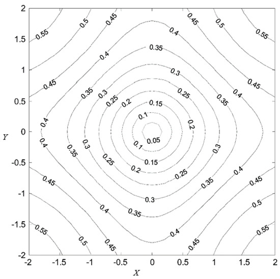 When the two variables are close together, the CIM behaves like an L2 norm, which is called the Euclidean zone; outside the Euclidean zone, the CIM behaves like an L1 norm, which is called the transition zone; as the two points move further away, the behavior of CIM is similar to the L0 norm, and this area is called the correction area [23]. Figure 1 gives the contour of and in 2-D, which means the distance from variables X and to the origin.