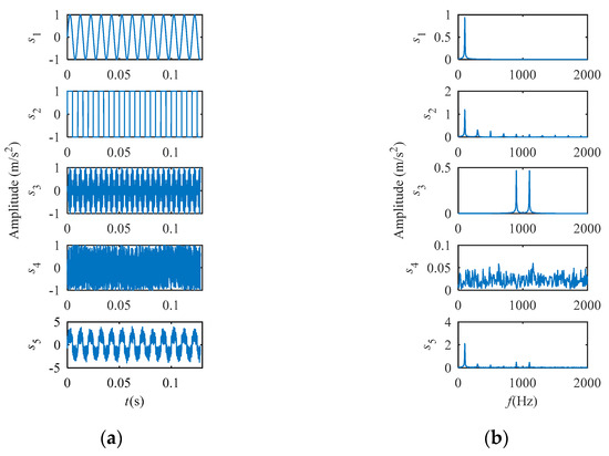A simulation was made to illustrate the capabilities of CIM. Five simulation signals s1, s2, s3, s4, and s5 are generated. s1 is a sine signal, s2 is a square wave signal, s3 is an amplitude modulated signal, s4 is random noise, where, s1, s2, and s3 are expressed as (11)–(13), s4 consists of random numbers from −1 to 1. s5 is the mix of s1, s2, s3, and s4, expressed in (14). The sampling frequency is 16 kHz, and the number of sampling points is 2048.