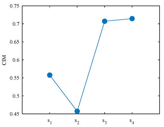 Calculate the CIM between the first four signals and s5, respectively. From (7), it can be conducted that when , CIM = 0; CIM > 0, for other cases. Additionally, the greater the difference between the variables X and , the greater the CIM value. Set X in (6) to s5, set in (7) to s1, s2, s3, s4, respectively. Then four CIM values are displayed in Figure 4, it can be seen that the CIM between s2 and s5 is the smallest which can be explained by the frequency spectrum (Figure 3b).