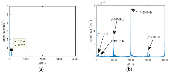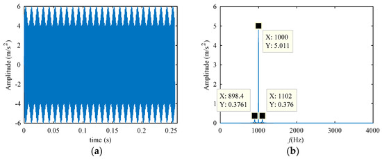 Use the amplitude-modulated signal to validate the role of the CCES, the simulation signal is expressed as (15), the sampling frequency is 16 kHz, and the sample points is 4096. The time-domain waveform is displayed in Figure 5a, where the obvious amplitude modulation phenomenon can be seen. Additionally, through the frequency spectrogram in Figure 5b, we can see the carrier frequency of 1000 Hz, and the modulation signal frequency shown by its sidebands is about 100 Hz.