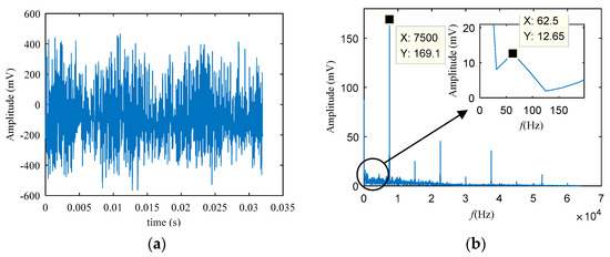 To verify the generality of the method SVD-CIM, the weak electrical signal provided by the research group is used for detection and verification, the weak sinusoidal signal is modulated and output. The test system is used to convert it into a digital signal for analysis. Figure 7 is the test system which consists of a signal generator (generate a sine wave), a weak signal amplification analog circuit board (amplify the signal by modulating), a signal acquisition instrument whose type is DH5908N from Donghua (The highest sampling frequency is 128 kHz for each channel, the minimum resolution of the voltage is 5 μV, and powered by a battery.), a shielding box, and a PC. The sampling frequency is 128 kHz, and the number of sampling points is 1,274,860, the target signal’s frequency is 93 Hz. This article uses 4096 points of the signal for verification. Figure 8 is the waveform of the modulated signal. The sine waveform cannot be seen in Figure 8. After the Fast Fourier transformation in Figure 8b, the first two highest amplitudes in the spectrum are 7500 Hz and 15,000 Hz. These high-frequency components have no relationship with the target signal of 93 Hz, it might be related to the means of pre-processing the signal, and 7500 Hz may be related to the carrier frequency. Amplifying the low-frequency band of the spectrum, only a frequency with a peak value of 62.5 Hz is found, so the spectrum cannot be directly used for analysis.