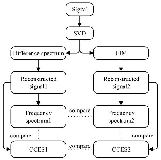 After performing SVD on the signal, the difference spectrum and CIM are used to select the SCs, respectively. Then, frequency spectrum after FFT is used to compare the difference between the two methods (different spectrum and CIM). The method analysis flowchart is shown in Figure 9. CCES is estimated also to compare with the frequency spectrum. In short, this experiment will compare two methods for choosing SCs and also compare two forms of the spectrogram. Select the first three SCs for signal reconstruction based on the difference spectrum shown in Figure 10a, and choose the SCs whose CIM is lower than the dotted line in Figure 10b for signal reconstruction.