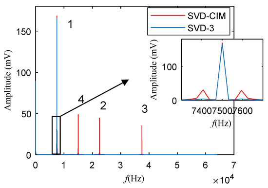 Figure 11 displays the frequency spectrum of the reconstructed signals chosen based on CIM (red line) and differential spectrum (blue line), respectively. For convenience, the method using difference spectrum is called SVD-3 in this section, because it just uses three SCs in this case, and the method using CIM is called SVD-CIM. In the frequency spectrum, method SVD-3 only extracts one frequency component, which corresponds to the spectral line with the highest amplitude in the original frequency spectrum (Figure 8). However, the proposed method SVD-CIM not only extracts the first four high-amplitude signal components corresponding to Figure 8, but also extracts the sideband of 7500 Hz which is related to the characteristic of the target frequency of 93 Hz shown in the partially enlarged view in Figure 11. The Roman numerals 1, 2, 3, and 4 in Figure 11, respectively, represent the first four frequency components of the amplitude in the original signal frequency spectrogram shown in Figure 8.