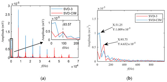 Finally, CCES is given for the two reconstructed signals in Figure 12. There are more spectral lines than the frequency spectrum in Figure 11. The red line is the CCES of SVD-CIM and the blue line is the CCES of SVD-3. Display in Figure 12 is better than the traditional frequency spectrum in Figure 11. Additionally, enlarging the 0~200 Hz spectrum, it can be seen that the peak of the blue line in this range is at 31.25 Hz, while the peak of the red line is at 93.75 Hz, which is the target frequency. The above phenomenon can be more obvious in Figure 12b.