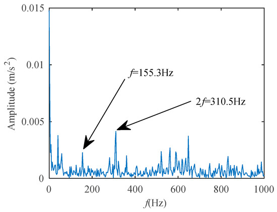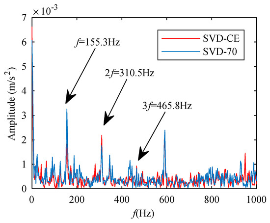 From Figure 18, we can find that the two-channel information can enhance the amplitude of the characteristic frequency at 155.3 Hz compared to Figure 16 and Figure 17. The amplitude of the red line is above 0.003, the amplitude of the blue line is above 0.005 in Figure 18. The red line of the single-channel in Figure 16 is below 0.002, and the amplitude of the blue line is below 0.004. The amplitude of the characteristic frequency in Figure 17 is close to 0.003. Additionally, combined with the SVD-CIM, there is obvious characteristics frequency of third harmonics and fifth harmonics. This shows that compared to single-channel information, two-channel information can enhance the signal’s fault characteristics, and through the processing of the SVD-CIM method, its CCES can make the characteristics more obvious. Usually, for the fault signal generated by the rotating component, the proposed method is added to the envelope spectrum analysis to demodulate the signal. However, the estimated CCES in this work does not need to perform the envelope demodulation analysis, which replaces the role of envelope spectrum. See Section 4.2 for specific analysis.