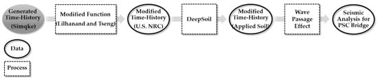 The purpose of this study was to investigate the seismic response of a bridge with multiple supports under seismic loads, considering both the soil properties of the area where the bridge was constructed and the wave passage effect. To this end, the seismic load acting on the bedrock was prepared to meet the design criterion presented in the standard of the U.S. NRC. In order to reflect the soil properties of the area where the piers are installed in the initial seismic load generated in this way, a ground response analysis was performed using DEEPSOIL—a site response analysis program. Furthermore, the wave passage effect was reflected by considering the shear wave velocity of the bedrock for each support. Prior studies on the seismic response of bridges during earthquakes have been conducted by applying each parameter individually [19,20,21,22,23], but studies that consider both the amplification and the wave passage effect of seismic waves due to the soil characteristics are insufficient. Therefore, in this study, the seismic response of the bridge during earthquakes was investigated by considering both soil properties in the area where the bridge is located and the wave passage effect of the seismic wave at each support. Figure 1 shows an overall flowchart of the analysis performed in this study.