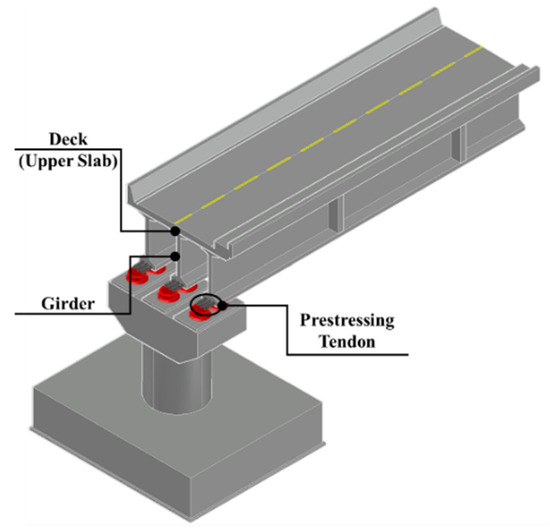 A pre-stressed concrete (PSC) girder bridge is a type of bridge in which a slab is placed on an I-shaped pre-stressed concrete girder; most of them are applied to spans of 20 to 40 m, and they are the most widely used because their construction cost is lower than that of girder bridges made of steel. In particular, PSC I-girders are mainly used to construct highway bridges or bridges that pass over streams, where the length between piers does not exceed 40 m and there is no restriction on the space under the bridge. In this study, a virtual PSC girder bridge and the area where it would be constructed were set up; a general PSC I-girder bridge is shown in Figure 2.