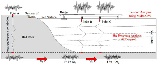 The effect on the spatial variation of a seismic load is determined by wave passage and wave scattering, and the effect on the wave passage of the seismic load is determined by the shear wave velocity of the bedrock when the seismic load travels through the bedrock. Since the time difference occurs when the seismic load transmitted through the bedrock passes through the bedrock, the characteristics of the seismic load acting on the foundation of the structure change [34]. If the bedrock is very hard, the effect of the spatial variation of the seismic load can be negligible, because the seismic load travels very rapidly, but if it is located at considerable depth or it is not sufficiently hard, its effect should be considered. Therefore, in this study, seismic loads with a time difference of were applied to the first pier (point B) and the second pier (Point C) of the PSC girder bridge, as shown in Figure 5. At this time, was calculated based on the shear wave velocity of the bedrock.