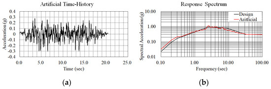 The artificial seismic load generated by SIMQKE—an artificial seismic load generation program—does not meet the criteria presented in the U.S. NRC standard. Lilhanand and Tseng [29] proposed a method of generating an artificial seismic load that is similar to the design response spectrum by applying a modification function, and verified that it affords sufficient reliability. Therefore, in this study, the seismic load generated in SIMQKE was modified using the modification function used in the prior study, and the modification function and modification time–history curve used in this study are as shown in Equations (1) and (2) and Figure 4.