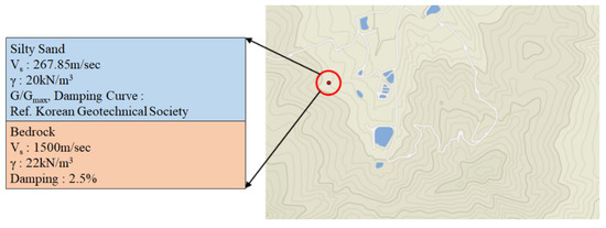 As shown in Figure 5, the seismic waves generated to meet the U.S.NRC standard are propagated to the ground surface throughout various soil layers. While the generated seismic wave is propagated to the ground surface, it can be amplified or diminished by reflecting the surrounding soil properties, and its characteristics can be changed [30,31,32]. To estimate the amplification of this seismic wave, the DEEPSOIL program [33] was employed in this study to perform a site response analysis. In the ground response analysis, the peak acceleration, shear deformation rate, shear wave velocity, and damping ratio of each soil layer were calculated, and the seismic load transferred to the free field was finally estimated.