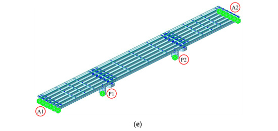 As shown in Figure 10a,c, the PSC I-girder bridge used in this study has three spans, where each span has a width of 12 m and a total length of 100 m, and the maximum inter-span distance is 40 m. The FE bridge model is detailed in Figure 10b,d,e. The FE model for I-girders, beams, and piers was built using beam elements, and the number of beam elements used was 331. Details of material constitutive models used for the I-girders, beams, and piers are shown in Table 2. The boundary conditions of the FE model are fixed at the abutment and the bottoms of the piers. Furthermore, in order to consider the bridge shoes installed at the connection of the bridge deck and the pier cap, the bridge deck and the pier cap were connected with a spring element.
