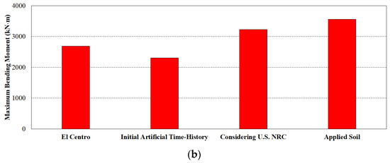 Assuming the bedrock shear wave velocity of Seismic Load 4 as 500 m/s, 571 m/s, 667 m/s, 800 m/s, 1000 m/s, 1333 m/s, 2500 m/s, and 4000 m/s, and applying wave passage effect as 0.08 s, 0.07 s, 0.06 s, 0.05 s, 0.04 s, 0.03 s, 0.02 s, and 0.01 s, respectively, the seismic response of the bridge was compared, as shown in Figure 14 and Table 6. We observed that insignificant differences appeared in the maximum bending moment during the increase in the wave passage effect from 0.00 s to 0.05 s. However, after 0.06 s, the maximum bending moment dramatically increased, and it was confirmed that the maximum bending moment increased by ~150% at 0.08 s compared to 0.06 s.