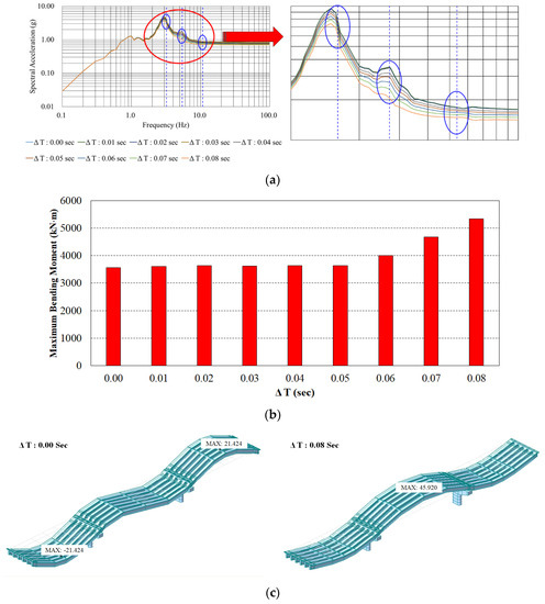 The response spectrum calculated from the response acceleration of the bridge shows small differences in the 1st, 2nd, and 3rd modes of the bridge, until 0.04 s of the wave passage effect. However, from 0.05 s, the response spectrum began to decrease in the major mode of the bridge, and in the 2nd mode of 0.08 s of the wave passage effect it reduced by ~58% compared to the 2nd mode of 0.00 s. This is because even if identical seismic loads act on the bridge, the acceleration in the opposite direction acts on the two piers due to the wave passage effect, as can be confirmed by the displacement shape of the deck of the bridge shown in Figure 14c. Based on the above results, to ensure the stability of the bridge under seismic loads, the wave passage effect should be considered under a shear wave velocity of bedrock of 1000 m/s (: 0.05 s) in the area where the bridge is constructed.
