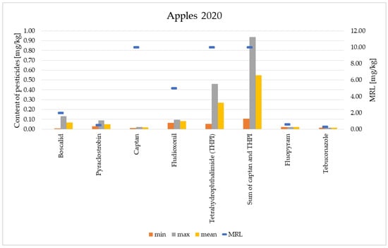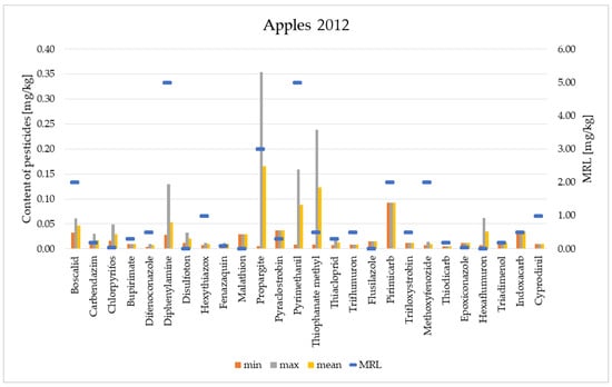 Figure 1 and Figure 2 present the content of pesticide residues in apples from the harvests of 2012 and 2020, respectively. Table 1 presents data concerning the levels of the individual pesticides in the analysed apples, taking into account the values of MRL and the limit of quantification (LOQ).