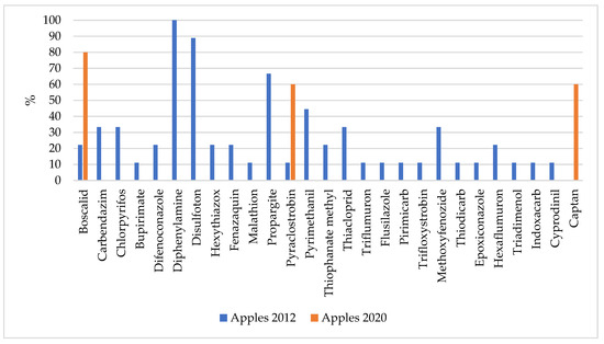 Frequency of occurrence of pesticides in the analysed samples of whole apples in 2012 and 2020, expressed as percentage share.