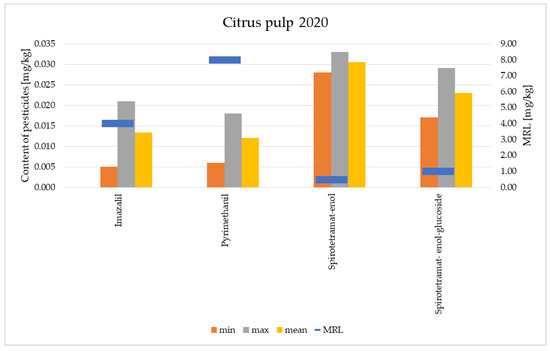In 2012, the presence of four pesticides were found in the flesh of citrus fruits—chlorpyrifos (insecticide), imazalil (fungicide), prochloraz (fungicide) and pyrimethanil (fungicide). In 2020, in the flesh of the analysed samples of citrus fruits the following pesticides were identified: imazalil, pyrimethanil and compounds from the spirotetramat group (insecticides), such as spirotetramat-enol and spirotetramat-enol-glucoside. In the years of the analyses, no instances of exceeded MRL values were noted for the identified pesticide residues.