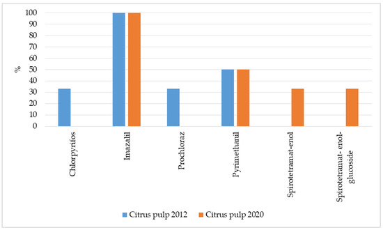 Frequency of occurrence of pesticides in the analysed samples of citrus flesh in 2012 and 2020, expressed as percentage share.