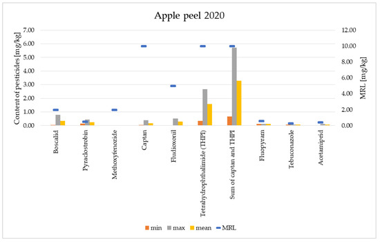 Figure 7 and Figure 8 present the residues of pesticides in the peels of apples from the years 2012 and 2020.