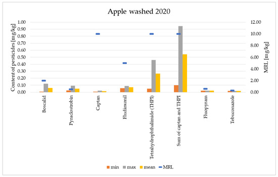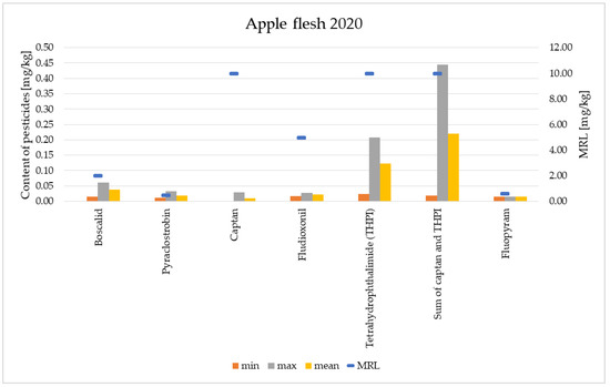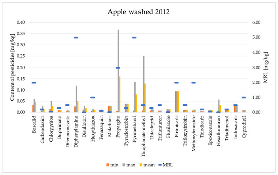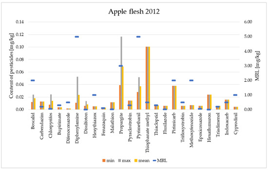 For comparison, the content of pesticides in the flesh of fruits was determined after peeling off the peels. Figure 9 and Figure 10 present the levels of pesticide residues in the flesh of apples in the years 2012 and 2020.