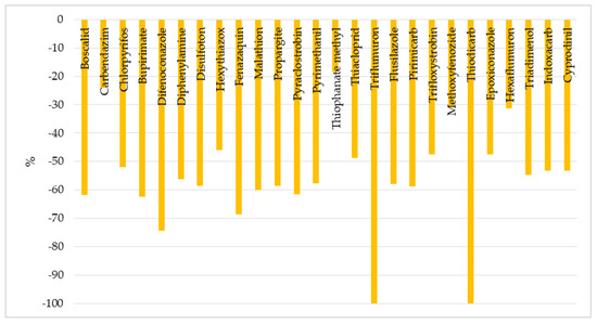 Our experiment demonstrated a significant effect of peeling on the content of pesticides in apples (Figure 11 and Figure 12). Peeling allowed us to reduce the levels of pesticides, expressed in %, within the range from 24% (carbendazim) to 100% (triflumuron, thiodicarb, tebuconazole).