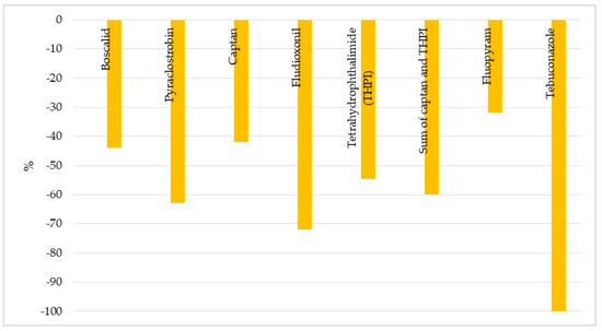 Accumulation of pesticides in fruits is dependent on the method of operation of plant protection agents [17]. In the case of systemic compounds, e.g., boscalid, bupirymat, cyprodinil, difenokonazol, flonicamid, fluopyram, pyraklostrobin, pirymethanil, pirymicarb, tebuconazole, tiachlopryd, tiofanate methyl, and trifloxystrobin, they penetrate into plant tissues, due to which their concentration in peeled apples is higher and more difficult to remove through the use of technological processes. In the case of nonsystemic contact operations (e.g., deltamethrin, fludioxonil and methoxyfenozide), a higher level of reduction in the levels of residues is observed in fruits with the peel removed [17].