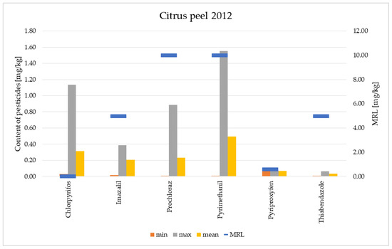 The levels of pesticide residues in the flesh of citrus fruits have been presented in the preceding subchapter (Figure 4 and Figure 5).