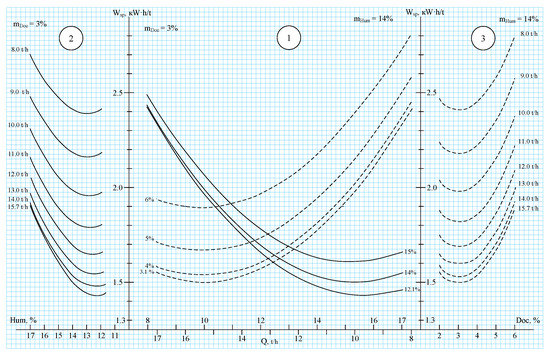 Based on the calculations, mathematical models were obtained that relate the specific energy input to the production line capacity, humidity and grain dockage (Equations (2) and (4)).