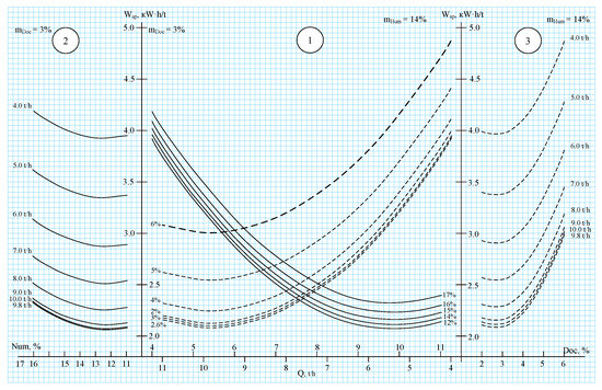 Nomograms of energy consumption for ZAV-20 (two production lines without disc separators).