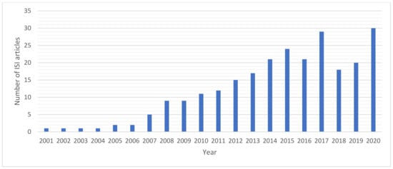 Yearly variations of the number of ISI articles concerning the topic “time-lapse ERT” spanning the period 2001–2020 (Source data: WoS database).