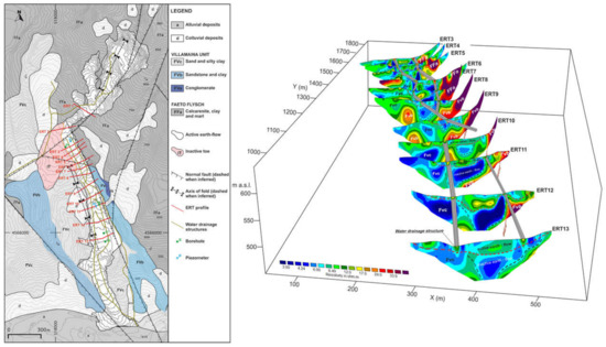 (Left) Geological map of the Montaguto earth-flow (Campania region, southern Italy) with the location of direct and indirect investigations. Red lines: ERT profiles. Green line: water drainage structures. Green dot: borehole. Blue triangle: piezometers. (Right) Fence diagram showing the locations of the 2D ERT (ERT 3–ERT 13) within a 3D space (after [44]).