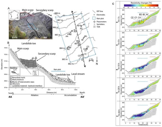(A) Laval landslide (ORE Draix, South French Alps) with location of the ERT line and of the equipment used for the rain experiment. (B) Cross section of the landslide. (C) Resistivity changes during the rain experiment (after [73]).