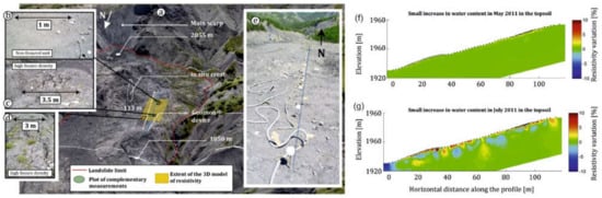 The map above (a) shows the location of the investigations carried out on the Super-Sauze landslide (Southeast France). The slope is characterized by non-fissured unit (b) and areas affected by a high fissure density (c,d). The dashed blue line (e) indicates the position of the GEOMON 4D system. The images (f,g) illustrate the soil cooling effect due to the rainwater. The percentage change in soil electrical resistivity after a small rainfall event could be due to the difference between rain and initial soil temperature (after [78]).