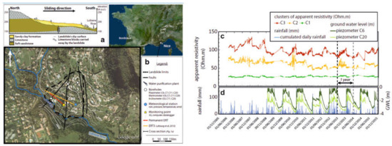 The map at the top reports the location of the survey carried out on the Vence landslide (south-eastern France), a simplified geological cross section (a) obtained along the sliding direction and the layout of the field survey carried out in the area. (b) Legend. The images below show (c) the variations of the daily median values of the three clusters of apparent resistivity measurements identified for the slope in the period 2006–2016, and (d) the accumulated rainfall index and groundwater level obtained by direct measurements in C6 and C20 for the same period (after [80]).