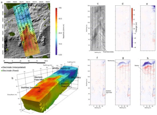(a) The baseline inverted image of the Hollin Hill landslide (southern Howardian Hills, UK) measured in May 2016; (b) surface resistivity in relation to a hill-shaded relief map from a UAV survey in May 2016. The six images on the right (c–h) report an overview of elevation and electrode coordinate changes at Hollin Hill, as captured by terrestrial LiDAR (after [84]).