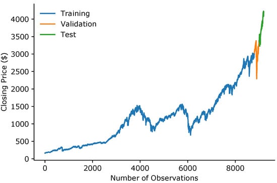 The closing price of S&P 500 stocks divided into training, validation, and test datasets.