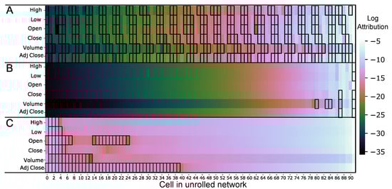 There were both commonalities between the models as well as model-specific features. Notably, the magnitude of the attributions for volume was consistently lower than the attributions for any other feature in a given day, shown in Figure 5. In addition, all three models demonstrated their largest magnitudes clustered towards the last inputs. Interestingly, the patterns of negative attributions presented differently in each model. The RNN model demonstrated an alternating pattern between positive and negative attributions, reminiscent of the banding pattern seen in Figure 4 and Figure 6. This result is contrasted against the LSTM, which had negative attributions localised at the front and the GRU, with negative attributions in the back half (0–40). Furthermore, the LSTM displayed fewer negative attributions than the RNN and the GRU. Lastly, it should be noted that the overall magnitudes found in the GRU model were higher than both the RNN and LSTM, particularly at the early inputs (cells 0–46).
