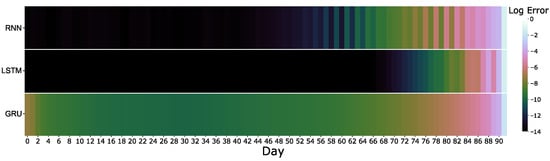 The LSTM architecture has successfully demonstrated its ability to learn long-term patterns in data []. Despite this, the LSTM network in this study assigns very little importance to data preceding the 78th cell. There are a few possibilities that could explain this. It may signal a lack of memory from the system, or it may reveal that the model is deliberately forgetting long-term information in order to improve the prediction. The LSTM ablation errors show similarities with those of both the GRU and RNN. Similar to the RNN, the LSTM displays a considerable noise surrounding the most recent inputs but lacks a distinctive banding pattern. Furthermore, the LSTM network demonstrates the spectrum decay of importance present in the GRU network, particularly between the 76–84th day. This decay suggests that this LSTM model displays the ability to learn, as this decay signals the network is retaining past information through the transduction of the cell state through the network. However, the LSTM long-term memory retention appears to be less critical in prediction than in the GRU.