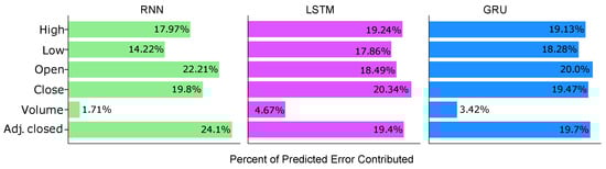 The focus of the permutation methods was to determine which feature contributes the most to the prediction for each RNN architecture. Interestingly, all three models assigned the lowest priority to the volume of traded stock, whilst there was no single feature with the highest priority between the three models, as shown in Figure 7. In addition, there was considerable similarity between feature importance between both GRU and LSTM networks, suggesting that their optimal predictions require each to consider the remaining four features equally. However, this is not unexpected considering that the normalised data for these four features show slight variations. In contrast, the RNN showed the most differences in where it placed importance in its features. The RNN appeared to emphasise the adjusted closing price and the opening rather than the high and low price for stocks.