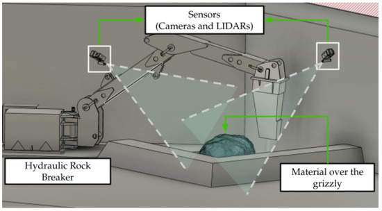The proposed system also allows identifying the oversized boulders deposited on the grizzly and notifying the operator every time the ore pass is blocked. Moreover, thanks to the use of 3D sensors and cameras placed on opposite sides of the hammer (see Figure 1), it is possible to show the operator the environment from different viewpoints and a 3D model of the rocks to be crushed. With this information, the operator can make better decisions.