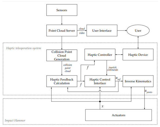 The proposed haptic tele-operation system is composed of eight sub-modules (see Figure 3). The Point Cloud Server acquires and merges the data from the two LIDARs, and segments it in three different point clouds, each one corresponding to measurements associated to reflections on the infrastructure, hammer, and material. These point clouds, and the acquired images, are sent to the User Interface where the different visualization are generated for the user. The Collision Point Cloud Generation module receives the point clouds and generates a so-called collision point cloud, which represents the points in the space to be avoided during tele-operation. The Haptic Feedback Calculation module estimates possible future collisions using the collision point cloud, the current commands on the end-effector (ueef), and the state of the hammer’s joints (x), and it generates haptic feedback information (f) for the haptic controller and haptic control interface. The Haptic Controller receives this feedback and generates the haptic force to be applied on the Haptic Device to alert the user of the limitation of the commands. At the same time, the Haptic Control Interface receives the control command on the end effector, which is the result of the operator force on the Haptic Device and the haptic force on the joystick, and the haptic feedback to limit the commands in case of any risky situation, for example, when the operator in spite of the haptic feedback decides to perform a risky task. Finally, these commands are converted from the Cartesian space (ueef) to the joint space (ujoints) using the Inverse Kinematics of the machine to handle the articulation actuators directly.