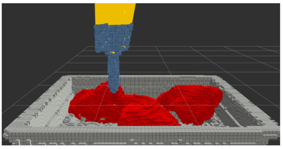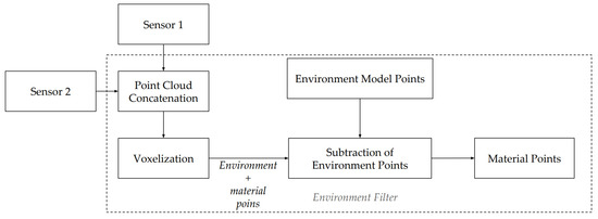 During operation, the environment model is used for determining the points that belong to the material model and hammer model. In each iteration, each new point cloud is voxelized and contrasted with the point cloud of the environment model. This comparison allows to subtract the points belonging to the environment. Once subtracted from the environment points, the resulting point cloud contain the hammer-points and material-points. Hence, to obtain the material-points, a new filtering process should be performed to subtract the hammer-points. This is done by first estimating the spatial region where the hammer is located, which is obtained using the current state of the hammer’s joints and the kinematic model of the hammer. This way, all those points within this space will be classified as belonging to the hammer and therefore eliminated. Figure 6 shows the process used to obtain the point cloud of the material. Sensors 1 and 2 correspond to the 3D LIDARs used to capture the working environment. The Point Cloud Concatenation module is in charge of joining the point clouds coming from both sensors. The Voxelization module is in charge of voxelizing the point cloud resulting from the union of both sensors, thus eliminating repeated points. The Environment Model Points corresponds to the point cloud stored in memory, which only contains points corresponding to the grizzly. The Subtraction of Environment Points module compares the current point cloud with the point cloud stored in memory, and removes the points that are found in both models. Finally, the Material Points module is in charge of publishing the points resulting from the previous module, which correspond to the material on the grizzly.