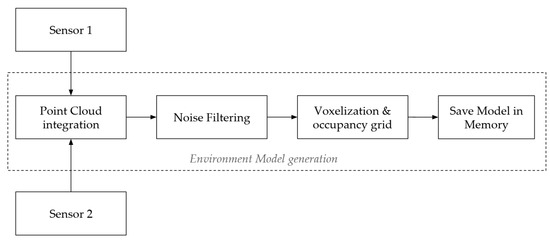 During the system’s initialization, the environment model is generated by successively integrating point clouds from the environment, without considering the ones corresponding to material or the impact hammer. This results in a very dense point cloud that is first filtered for deleting isolated points that could be generated by noise on the sensors. Once the noise has been eliminated, the cloud is voxelized in 3D square voxels, reducing the number of point and maintaining the occupancy information of the environment in the space. Finally, this cloud is saved as the environment model. Figure 5 shows the main modules of the described process. Sensors 1 and 2 correspond to the 3D LIDARs used to capture the model of the environment through point clouds. The Point Cloud Integration module corresponds to the process of joining the point clouds of both sensors and performing the task of integrating these successive point clouds over time. The Noise Filtering module is responsible for removing noise. The Voxelization & Occupancy Grid module is in charge of voxelizing the point cloud in order to eliminate repeated points and to show the occupancy of the space. And finally, the Save Model in Memory module stores the resulting point cloud in memory for later use.