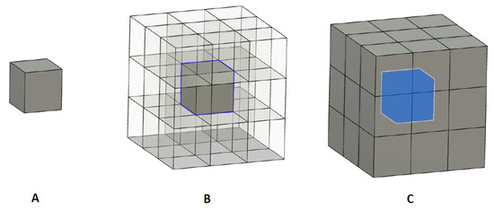 (A): Single voxelized point; (B): 3 × 3 × 3 structuring element with origin in central point; and (C): result of dilatation operation.