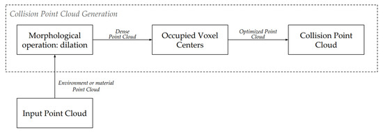 The generation of collision points starts with a dilation operation over the environment point cloud, and applies over the material point cloud, which is implemented in each case using as structuring element cube of 3 × 3 × 3 points. The dilation of the input point cloud by the cube of 3 × 3 × 3 (which corresponds to a cube of 27 points), can be understood as the locus of the points covered by the cube of 3 × 3 × 3 point when the center of it, moves within the input point cloud. The dilation operation is defined as follows: