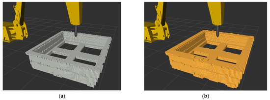 In the case of requiring to generate a thicker collision point cloud, several dilation iterations should be performed in the same cycle. This would result in a larger safety distance between the real object and end effector. Figure 9 shows a comparison between the point cloud of the generated grizzly model and the point cloud resulting from the dilation process.