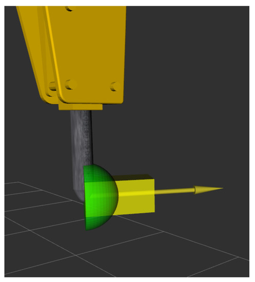 For simplicity, in this work two different geometries are used for representing the virtual collision region: A rectangular cuboid and a semi-sphere, which are positioned at the end-effector point that is located on the tip of the chisel. Figure 10 shows these geometries, which are oriented with respect to the direction of movement of the end-effector. In this simulation, the yellow arrow corresponds to the direction of motion of the end-effector.