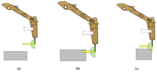 Figure 11. (a) Rectangular cuboid and semi-sphere regions without intersection with a collision point cloud. (b) Rectangular cuboid intersects the collision point cloud. (c) Semi-sphere region intersects the collision point cloud and the cuboid does not. The yellow rectangle represents the cuboid. The green semi-circle represents the semi-sphere. The white arrow corresponds to the hammer direction. - Rectangular cuboid intersects the collision point cloud (see Figure 11b). In this case, the velocity will be reduced according to the distance to the obstacle (see explanation in next sub section);